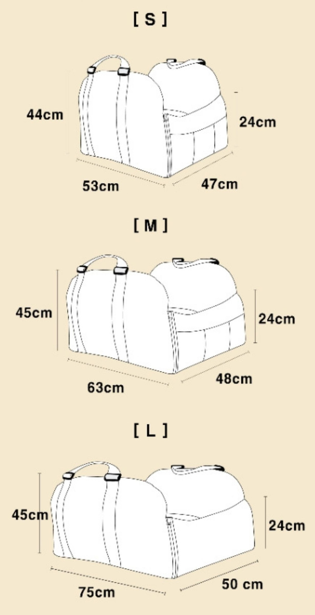 重さ S サイズ:約3.5㎏ Mサイズ:約4.5㎏ Lサイズ:約5.5㎏ ペットの大きさ対応目安 Sサイズ:4kg~10Kg Mサイズ:8kg~15kg Lサイズ:12kg~25kg 材質 生地:ナイロン、綿、ポリエステル ※サイズの測り方はなるべく誤差が出ないように努力しておりますが、商品の立体の特性上若干の誤差(約1~4cm前後)が生じる場合がございます。